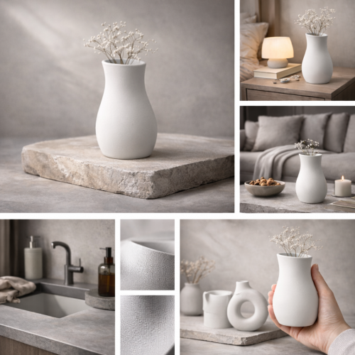 Объект напечатан из матового переработанного пластика. Поверхность сохраняет тонкий ритм слоёв — визуальный след процесса и времени. Эта структура является частью его происхождения и характера.